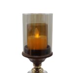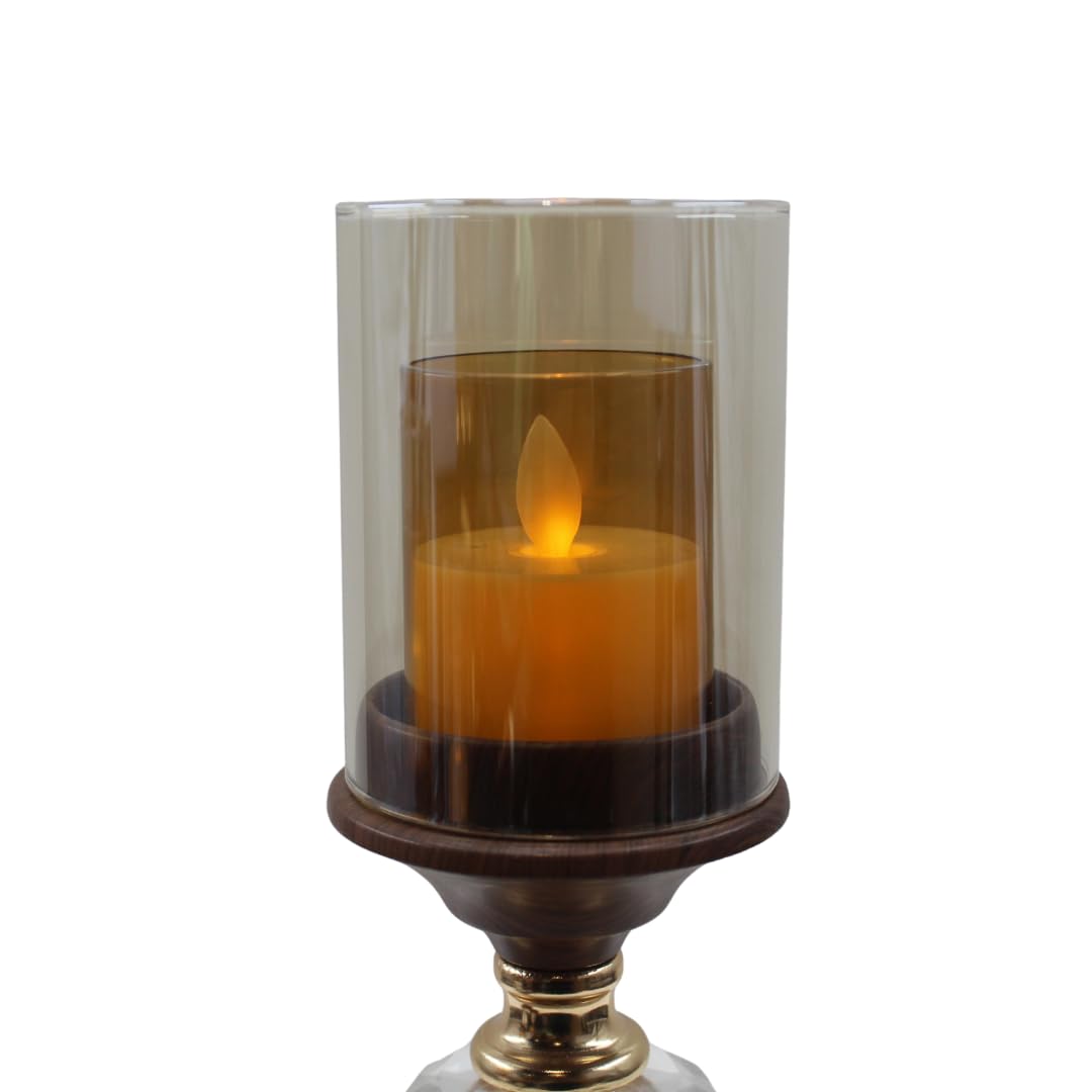 Transform your living space with this exquisite set of three decorative candle holders from ELARE. Each piece showcases a sophisticated blend of wood, glass, and metal, featuring elegant crystal accents and a lustrous golden powder-coated finish. The hurricane-style design with decorative metal stands creates a captivating visual display, perfect for adding warmth and ambiance to any room. Standing at heights of 30cm, 26cm, and 22cm, this graduated trio makes a stunning centrepiece for your dining table, console, or mantelpiece. The clear glass cylinders beautifully showcase flickering candlelight whilst the ornate crystal detailing on the stems adds a touch of glamour. Ideal for festival celebrations including Diwali and Christmas, these versatile candle holders complement both traditional and contemporary décor styles. Whether you’re hosting an intimate dinner party or celebrating special occasions, this tabletop candle holder set creates an inviting atmosphere. Each holder accommodates pillar or tealight candles, making them practical for everyday use or festive decoration. The combination of rich golden tones with transparent glass elements ensures these pieces coordinate effortlessly with existing home accessories. Perfect as a thoughtful gift or as an elegant addition to your own home décor collection.