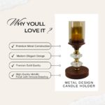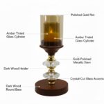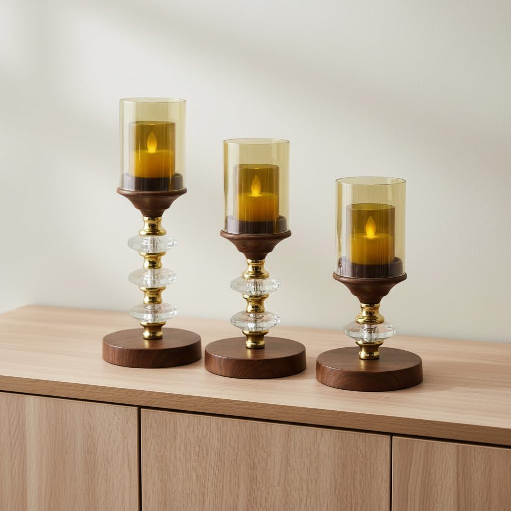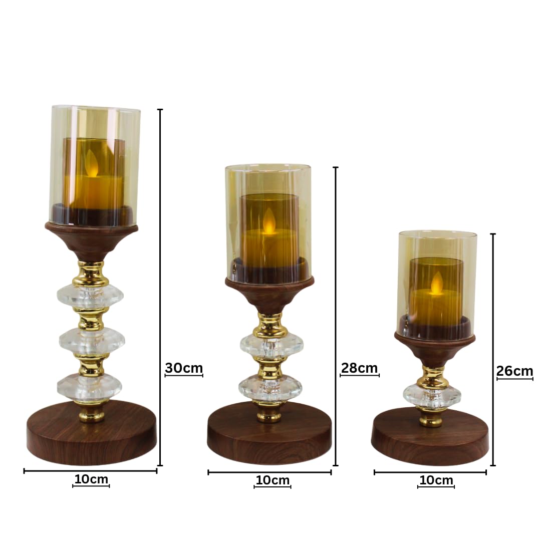 - ELEGANT SET OF 3: This decorative candle holder set includes three graduated sizes (heights: 30cm, 26cm, 22cm) crafted from premium wood, glass, and metal with a stunning golden finish and crystal accents for sophisticated home décor